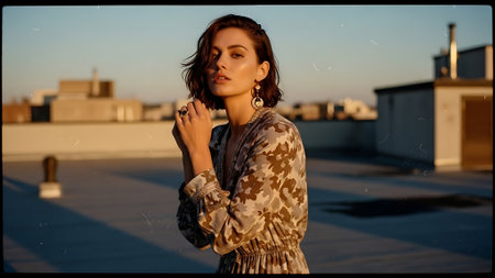 Stylish woman wearing long orange dress posing on rooftop during sunset, creating elegant and fashionable scene