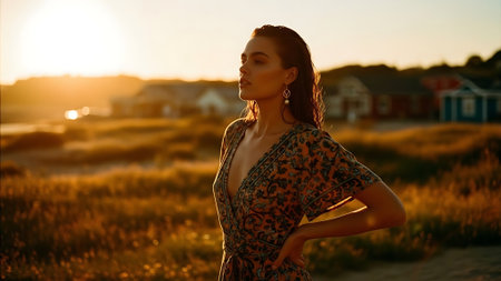 A woman with wavy hair wearing a colorful embroidered dress, posing against a sunset backdrop, showcasing vibrant makeup and a confident expression