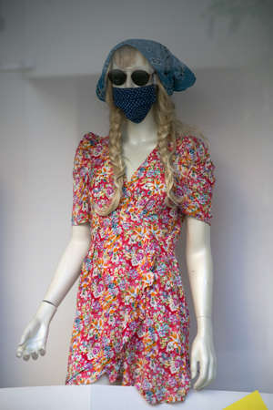 Closeup of fabric mask and summer dress on mannequin in a fashion store shoowroom