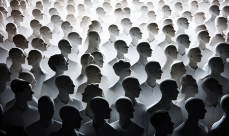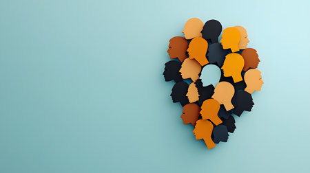 Silhouettes of diverse faces are artistically arranged on a light blue background, showcasing unity. The composition conveys emotions of connection and solidarity among individuals.