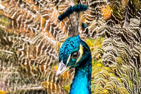 Portrait of beautiful peacock with colorful feathers. Animal portrait.