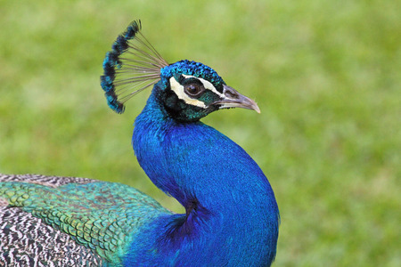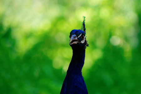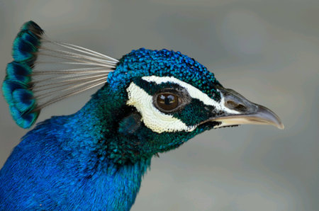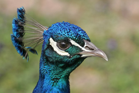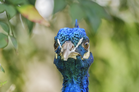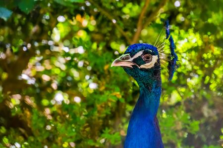 the face of a blue peafowl in closeup, Colorful Indian peacock, popular decorative bird specie