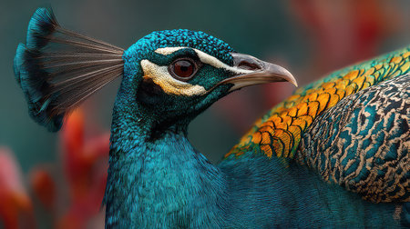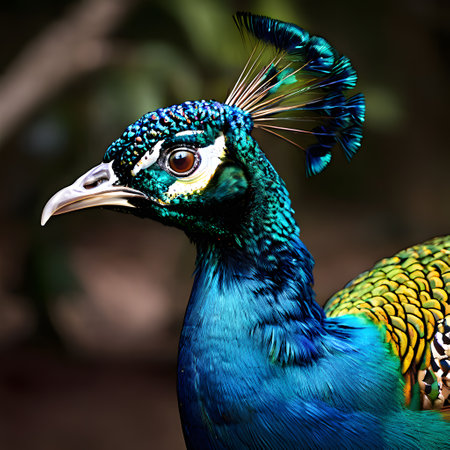 Close-up of an Indian peafowl displaying its vibrant and iridescent plumage in profile