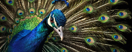 Vibrant colorful peacock with bright open tail. Concept of wildlife beauty, bird watching, habitat, and exotic fauna. Dark background