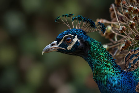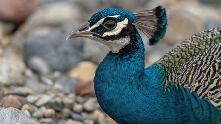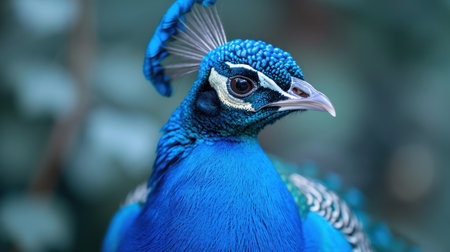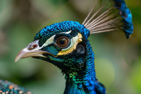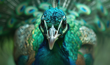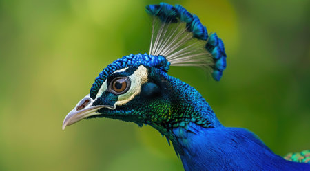 A vibrant portrait of a peacock showcasing its stunning blue and green feathers. This close-up image captures the elegance and beauty of this majestic bird in a serene environment.