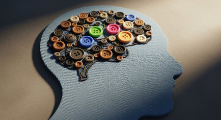 Light blue human head silhouette with a brain made of various colorful and neutral toned buttons, symbolizing complex thought, creativity, and mental processes.