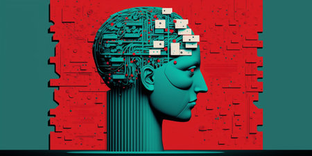 futuristic robotic head, artificial intelligence, brain concept, colorful abstract background, high tech design, innovation, digital art, science fiction elements, profile view, vivid colors