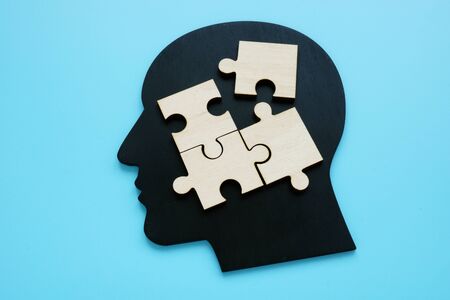 Head of man and wooden puzzle. Alzheimers disease, dementia and mental health concept