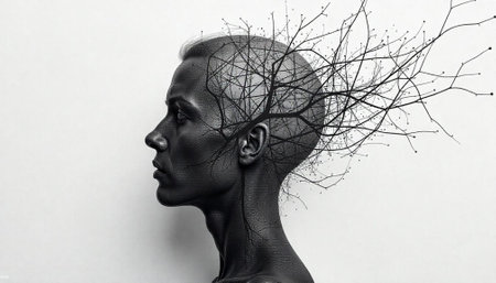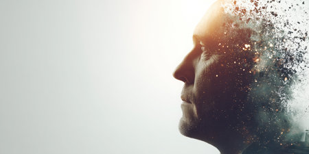 A powerful visual representation of a man's profile, symbolizing the complexity of thoughts and emotions through fragmentation and abstract elements.