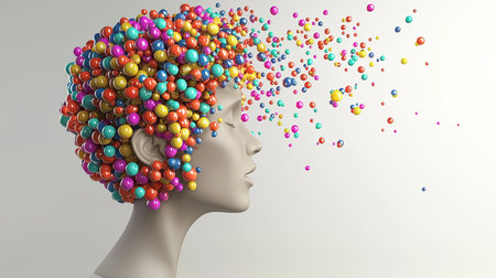 This vibrant and imaginative image showcases an abstract representation of hair made from colorful spheres, symbolizing creativity and artistic expression.