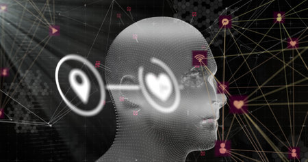 Image of network of connections over head and icons. Global business and digital interface concept digitally generated image.
