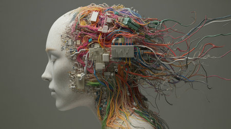 Futuristic head sculpture with colorful wires representing technology and connectivity, embodying a unique blend of art and innovation
