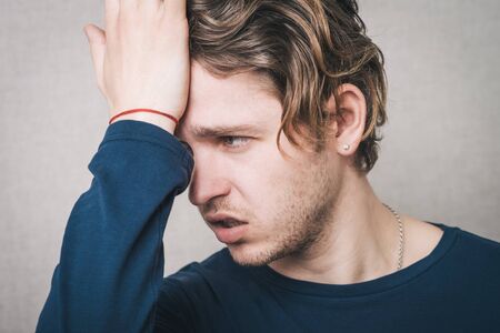 young sad man hand in head on white background