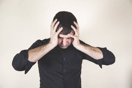 Portrait of a very stressed young man suffering a headache and covering his face on a black background