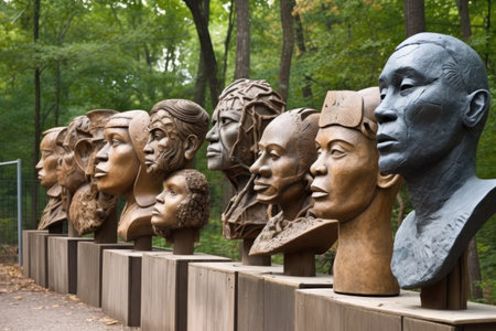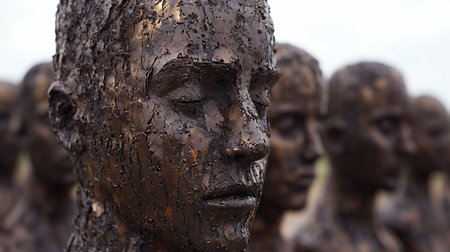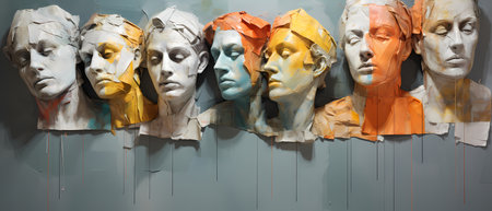 A group of statues with different facial expressions are shown, AI