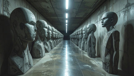 In a sterile, underground facility, endless rows of identical humanoid figures stand silent and waiting.