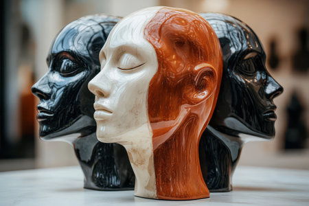 Three mannequin heads in different colors are arranged closely together showcasing artistic design and variety in texture and form.