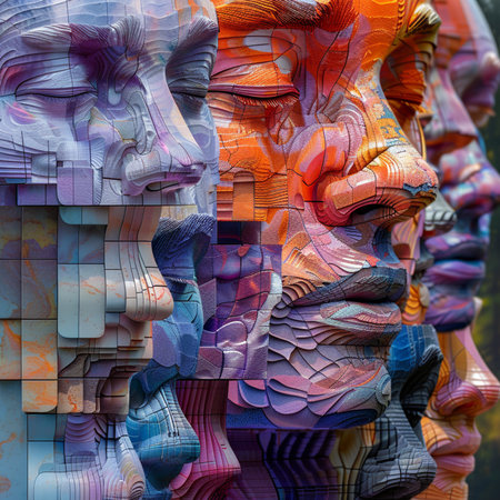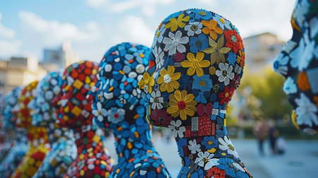 A close-up view of an abstract human head sculpture, featuring a mosaic of vibrant, multi-colored geometric shapes and patterns, representing complexity and diversity.