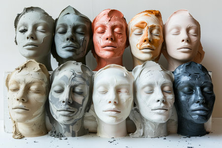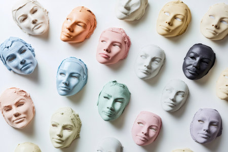 Collection of colorful plaster face masks arranged on a white surface explores themes of identity, diversity, and individuality