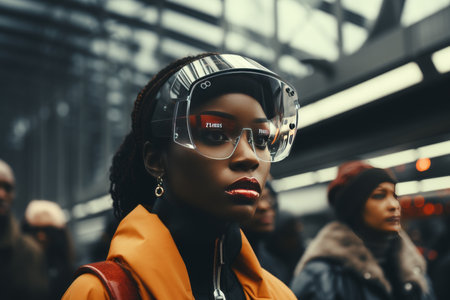 An urban environment featuring a woman with a holographic biometric scan displayed on her face, as she navigates through a futuristic cityscape.