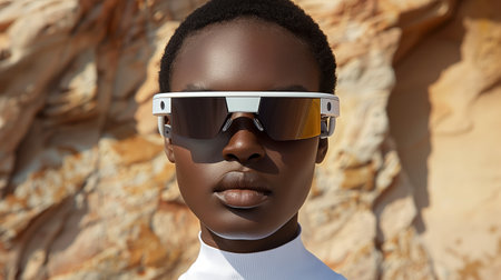 Woman Wearing Smart Glasses in Front of Rock Formation