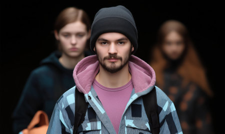 A stylish young man stands with a thoughtful expression, wearing a warm scarf and hat.