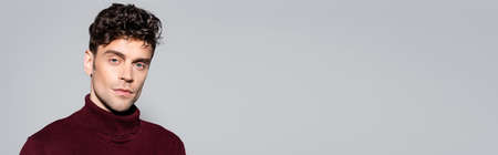 young man in burgundy turtleneck jumper posing isolated on gray, banner