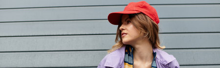 Pretty and stylish african american woman looking at camera near brick wall, banner