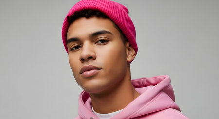 A studio portrait of a young, stylish man looking confidently at the camera. He is wearing a bright pink beanie and a matching pink hoodie against a plain light gray background.