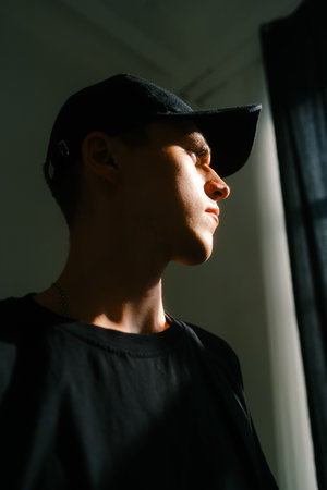 Close-up of a man wearing a black t-shirt and backward cap, leaning against a concrete wall while gazing thoughtfully to the side