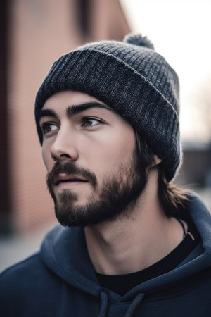 Portrait of teen boy 17-18 year old wearing knitted hat outdoors close up.