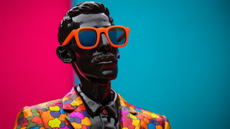 human statue standing out in vibrant neon colors and a sweater, showcasing intense chromaticism and african influence. the bright colored sunglasses add flair to the lifelike figure with shallow depth of field. resembling the artistic styles of mike campau and tristan eaton. ai generated