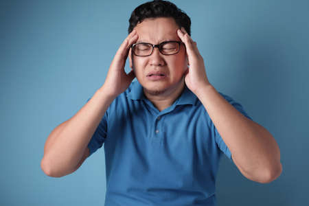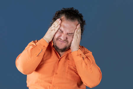 headache or migraine. man in pain clutching his head. and closing eyes. discomfort ache and stress concept. portrait of a young bearded guy on blue background. emotion facial expression.