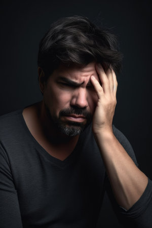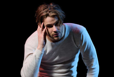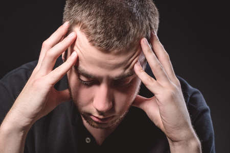 Young handsome man in a black shirt sits and holds his head on a black background. Experiencing stress, pain