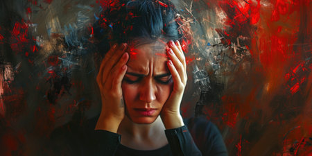 A woman holds her head in her hands, looking distressed, against a colorful wall