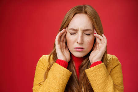 Girl trying keep thoughts together feeling tensed and pressured close eyes frowning rubbing temples, feeling headache or migraine, focusing on thoughts over red background