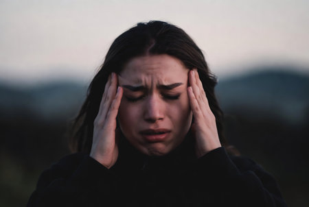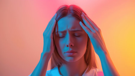 A young woman shows signs of stress and headache, placing her hands on her temples, in a cozy indoor setting with softly blurred lights, capturing a moment of intense emotion.