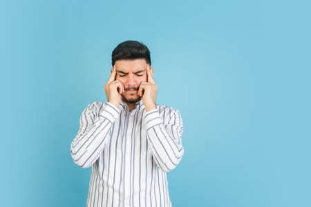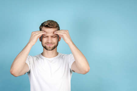 Exhausted, sick young guy with migraine symptom touching forehead, feeling headache and standing isolated on blue copy space background in white t-shirt. Concept of sickness
