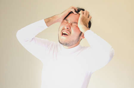 Youngman wear white T-shirt,2 hands touch his head , dismal feeling.