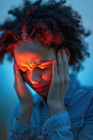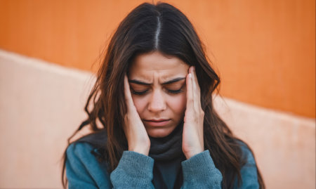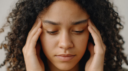 This intimate close-up presents a young woman with curly hair, portraying a moment of stress and anxiety as she touches her head, inviting reflection on mental wellness.