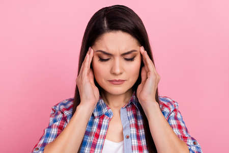 Photo of unsatisfied person closed eyes arms fingers touch temple isolated on pink color background