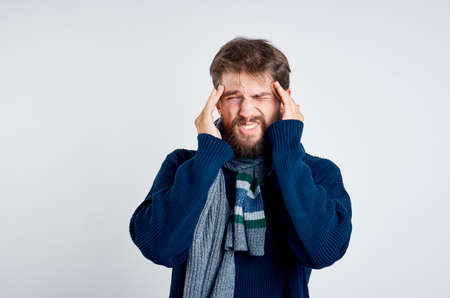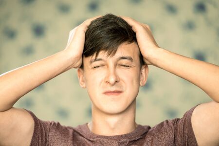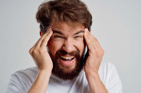 A man holds his head with his hands. Sensation of headache, migraine and dizziness. Headaches from stress or overwork