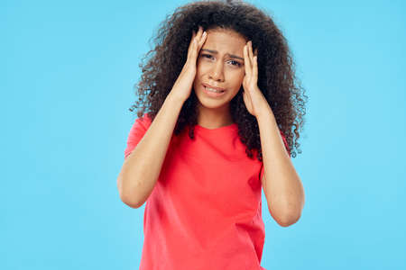Young afro american woman clutching her head with her palms while suffering from a migraine. Portrait on a purple color background.