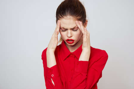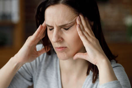 Upset young woman suffering from headache. Exhausted woman with closed eyes massaging the temples having painful sensations. Migraine, high blood pressure, chronic fatigue and eyestrain concept