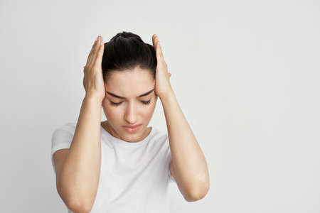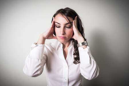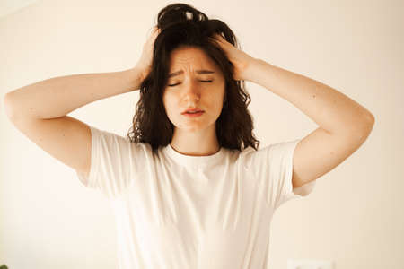 Portrait of young dark hair woman, annoyed and frustrated. She is touching her temples. Headache, mental disorders bulimia, addiction.