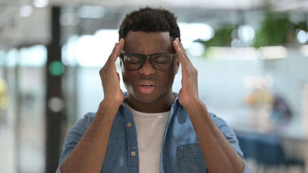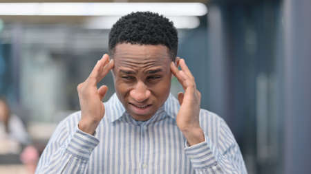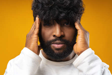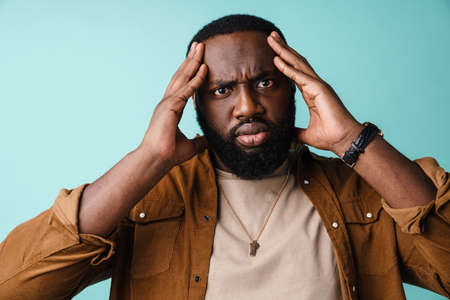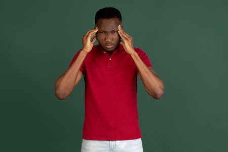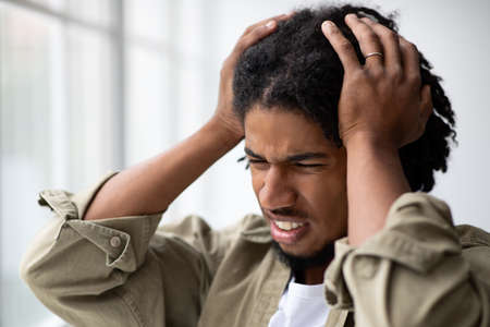 Stressed young african american man feel pain and having terrible strong headache concept. Tired upset guy massaging temples and suffering from migraine