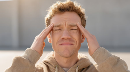 A young man squints and shields his eyes from bright sunlight, expressing discomfort and stress outdoors, capturing a relatable moment of everyday life.