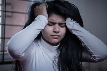 Stressed indian girl sit on couch touch temples to reduce severe strong unbearable head ache. Sick or desperate woman frown face close up image. Panic attack, mental physical problems patient concept
