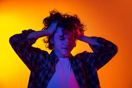 Portrait of young curly man in checkered shirt touching head in headache isolated over gradient yellow orange background in neon light