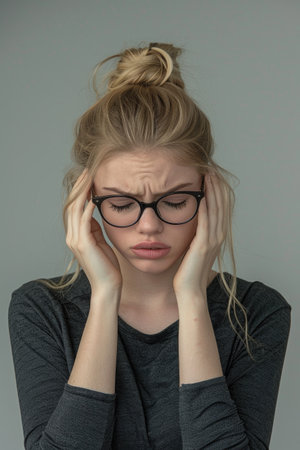 The young woman appears overwhelmed, her eyes shut tightly as she holds her head, conveying a feeling of deep stress and anxiety.